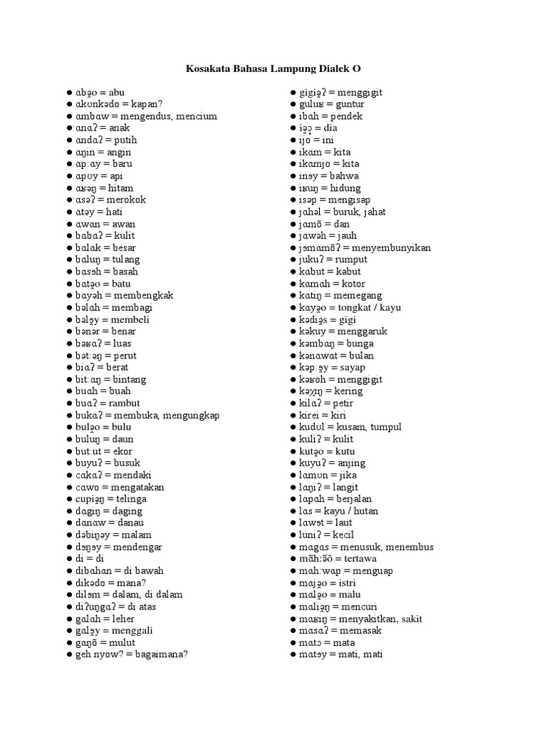 Kosakata dalam dialek masing masing juga terdapat beberapa kata kata yang mempunyai arti sama tetapi berbeda kata katanya. Kosakata bahasa lampung dialek o ɑbə o abu gigiə ʔ menggigit ɑkʊnkədo kapan. Bahasa lampung secara garis besar dapat dibedakan menjadi dua dialek yakni dialek o dan dialek a. Kami memiliki harapan agar bahasa lampung selalu dilestarikan sebagai rasa cinta.